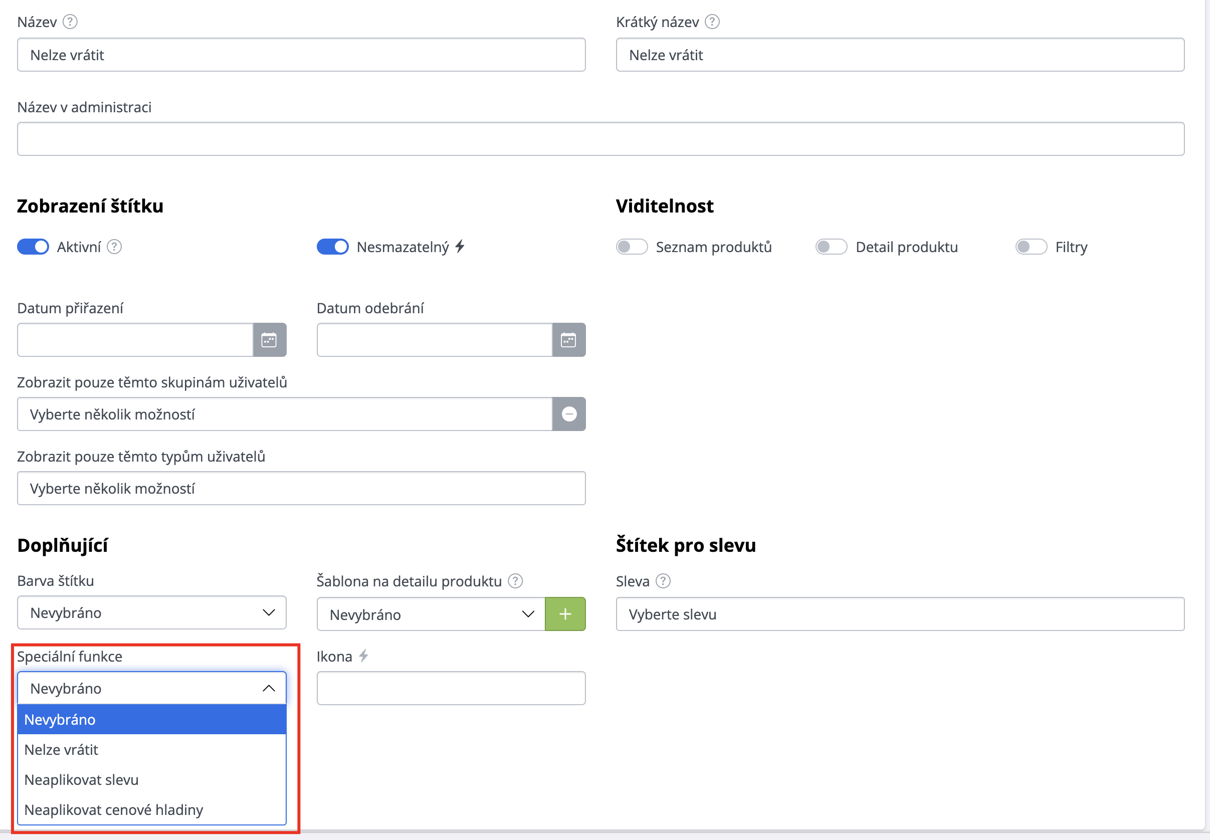Štítkům je od ledna 2026 možné přiřadit speciální funkci, podle které se pak bude štítkem označený produkt chovat. Tato funkcionalita nahrazuje speciální funkce kampaní (které již nerozvíjíme). Funkční štítky můžete zakládat kdykoliv potřebujete bez zásahu vývojářů. Jako první jsme implementovali funkce „Neaplikovat cenové hladiny“, „Neaplikovat Globální slevu“ a „Nelze vrátit“. Postupně plánujeme přidávat další funkcionality. Také je možné je formou zakázek rozšiřovat o specifické chování pro konkrétní e-shopy, vzniká zde tak prostor vyřešení vašich individuálních potřeb.