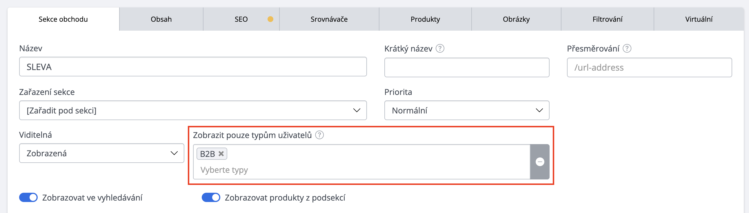 Typy uživatelů zpřístupní možnost upravit viditelnost sekcí – některé mohou být dostupné pouze přihlášeným uživatelům nebo jim pomocí negace jiné sekce (určené pouze koncovým zákazníkům) můžete skrýt.