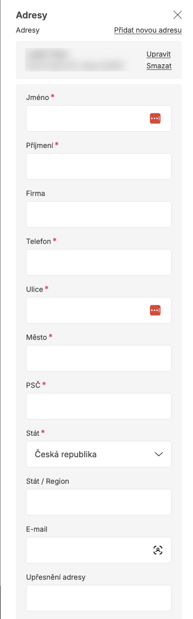 Pokud je povolena editace adres ze strany zákazníka, tak je možné editovat nebo přidat adresy přímo v košíku kliknutím na Přidat / Upravit adresu.