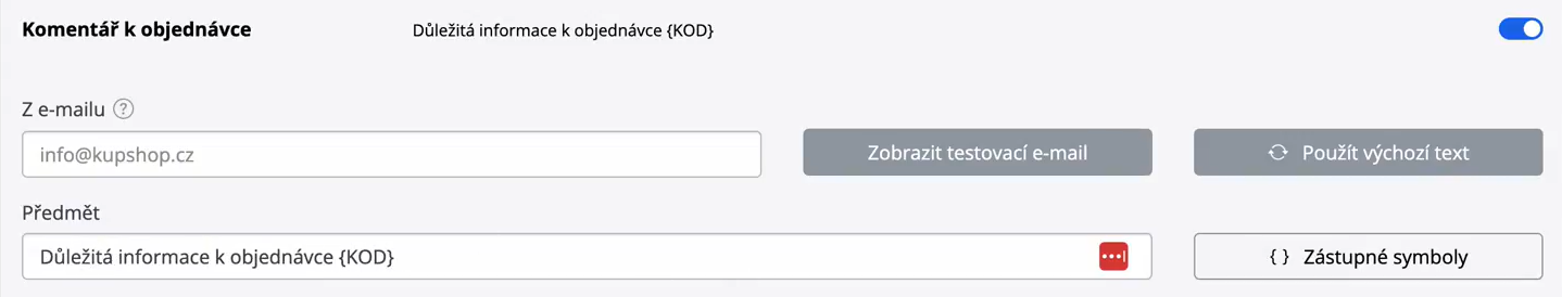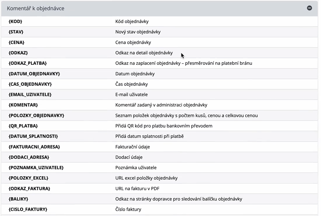 Zástupné symboly slouží k automatickému vkládání dynamických informací (např. údajů z objednávky) do textu i předmětu emailů. Mezi typické symboly patří číslo objednávky, jméno zákazníka, informace o platbě, popis faktury nebo zvolený způsob dopravy.