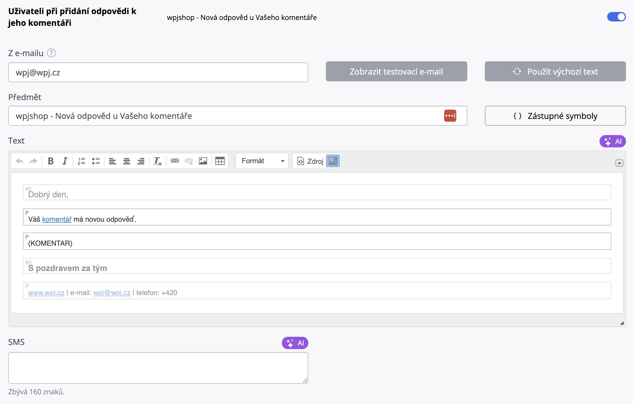 O vložení zpětné vazby ze strany e-shopu může být zákazník informován e-mailem. Text zprávy můžete editovat v ➡️ Nastavení > E-maily. Zde můžete také pomocí přepínače Aktivní zvolit, zdali se e-mailová notifikace zákazníkovi odesílat má či nikoli.