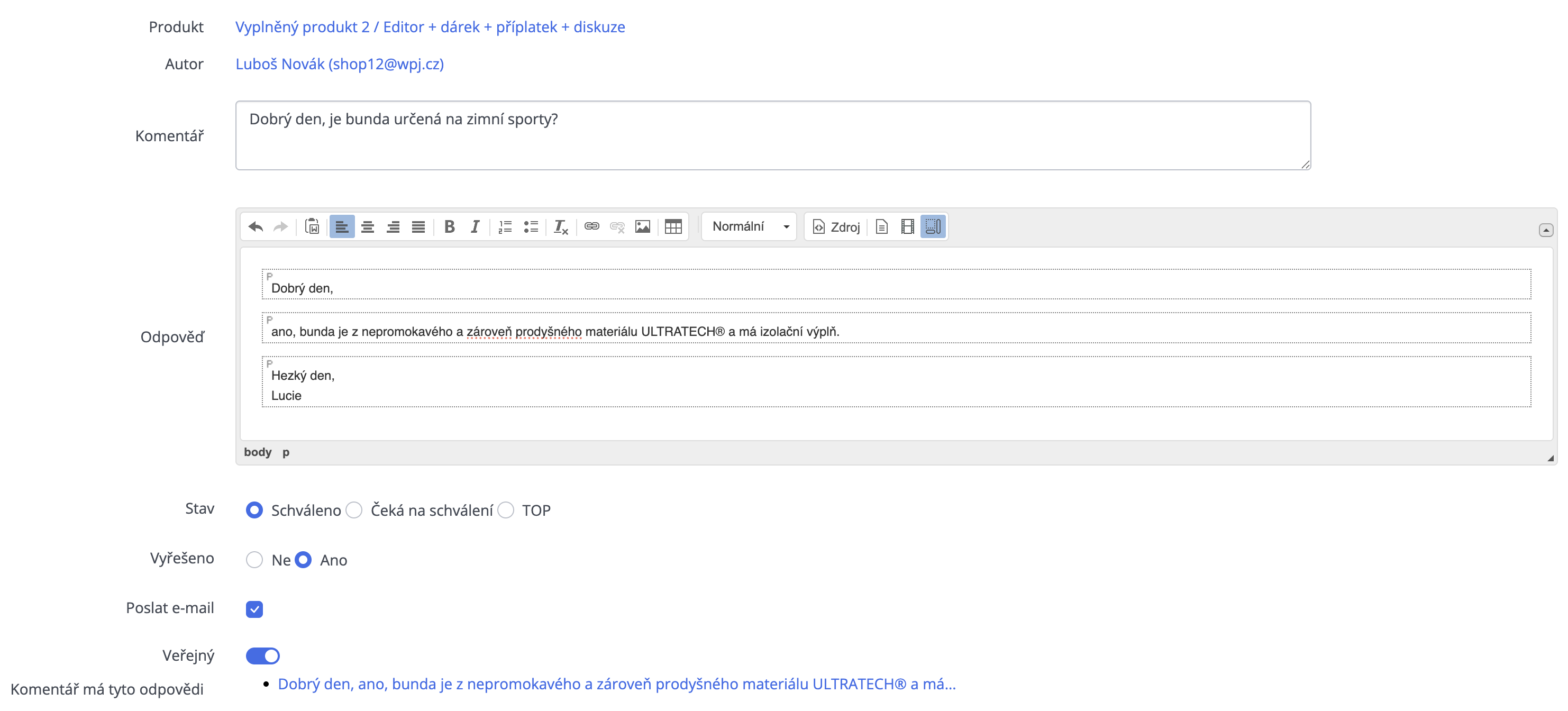 Na seznam všech zatím nezodpovězených komentářů se dostanete pomocí odkazu v levém menu. V případě, že chcete zákazníkovi na jeho příspěvek reagovat, využijte pole Odpověď. Jakmile odpověď uložíte, objeví se i na e-shopu viditená i pro ostatní návštěvníky.