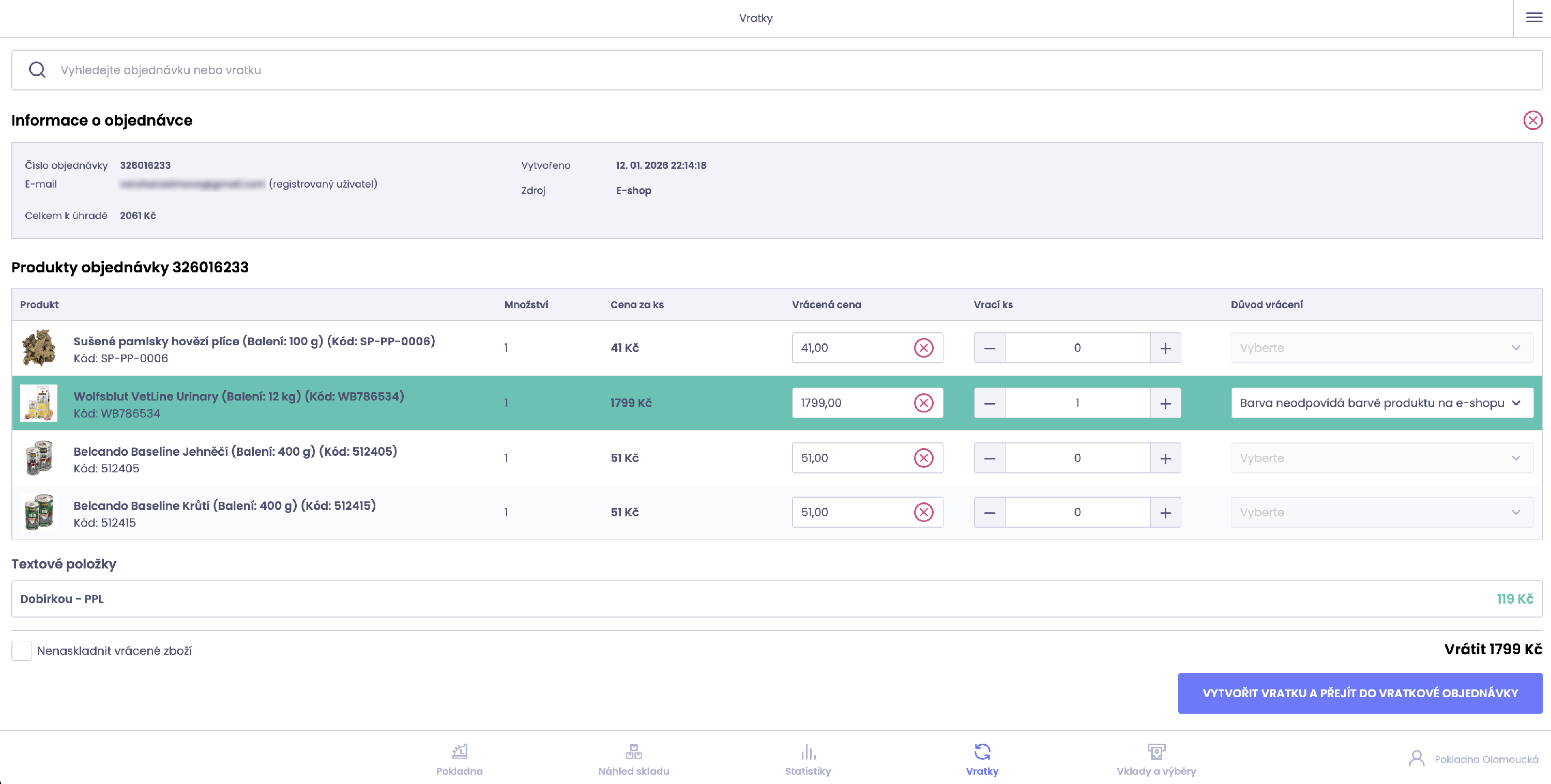 Stisknutím tlačítka „VYTVOŘIT VRATKU A PŘEJÍT DO VRATKOVÉ OBJEDNÁVKY“