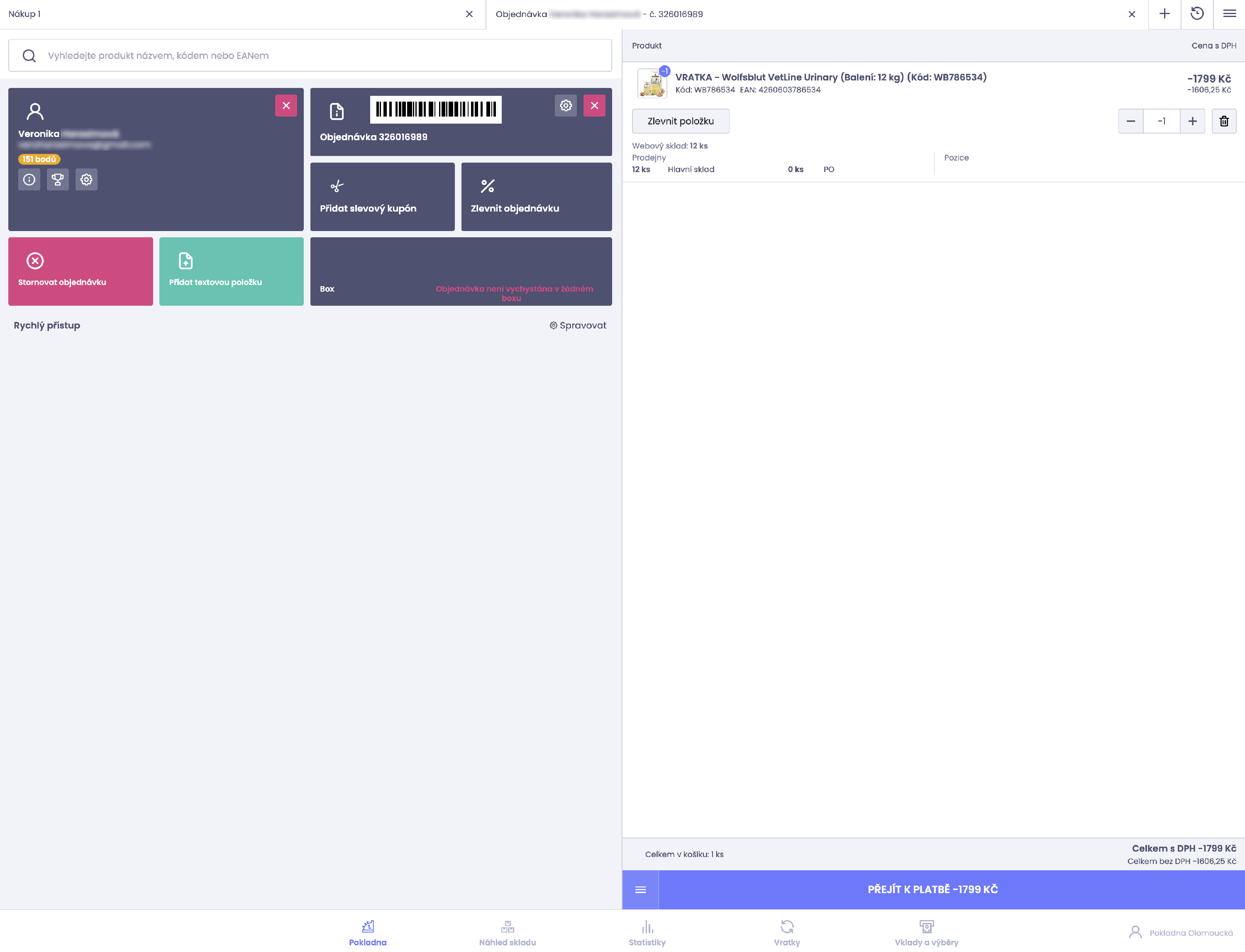 - Následně se pokladna přepne do nákupního procesu a automaticky se načte právě vytvořená vratková objednávka, se kterou můžete dál pracovat.