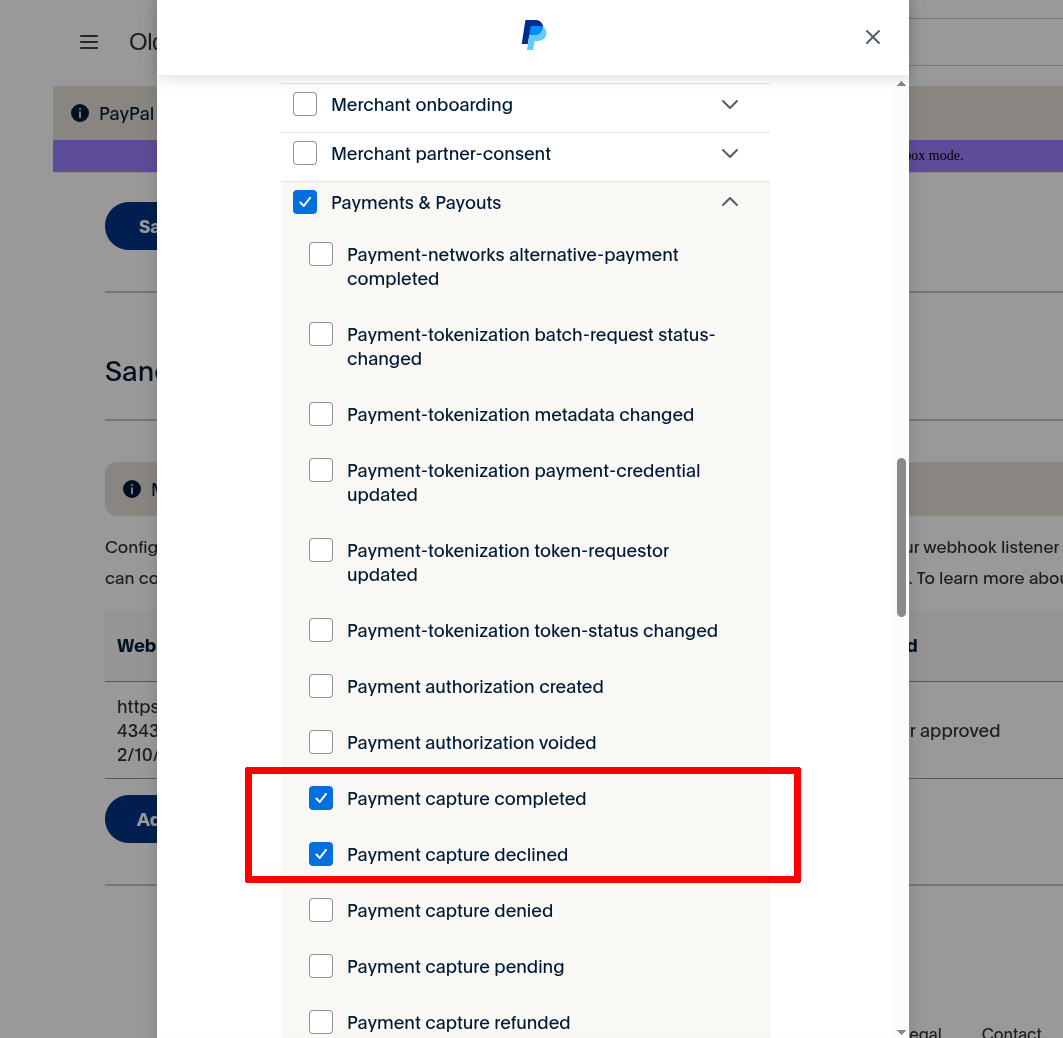 V zobrazeném dialogu vložíte URL adresu z nastavení eshopu. Dále je potřeba nastavit typ. V sekci Checkout vyberte možnost Checkout order approved a v sekci Payments & Payouts vyberte Payment capture completed a Payment capture declined.